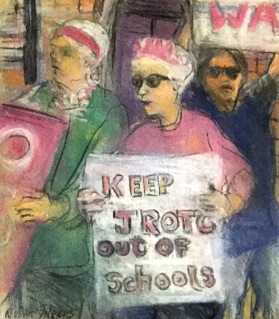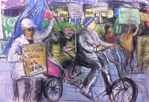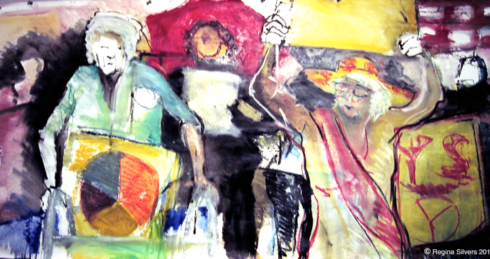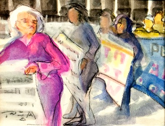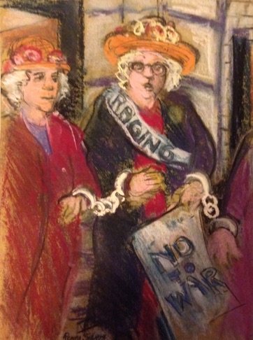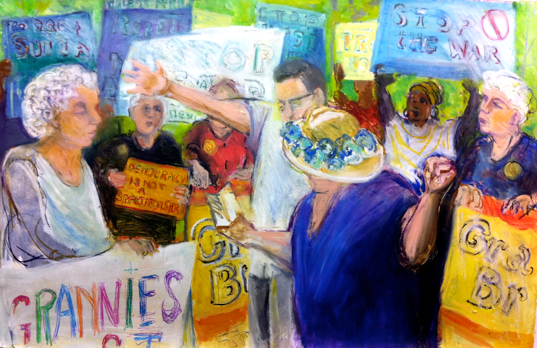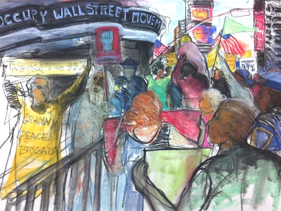 2013 was an exciting year for me. My solo exhibition The Granny Peace Brigade was shown at Saint Peter’s Church. It featured 60 feet of paintings and drawings derived from my on–the–scene photos and sketches, documenting the public protests of this feisty group of senior peace activists. Happily, many “grannies” were on hand to sing and celebrate with me.