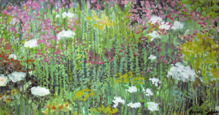 #692 Field with Phlox Gouache on paper, 7 x 18”w, Framed 13 x 24”w